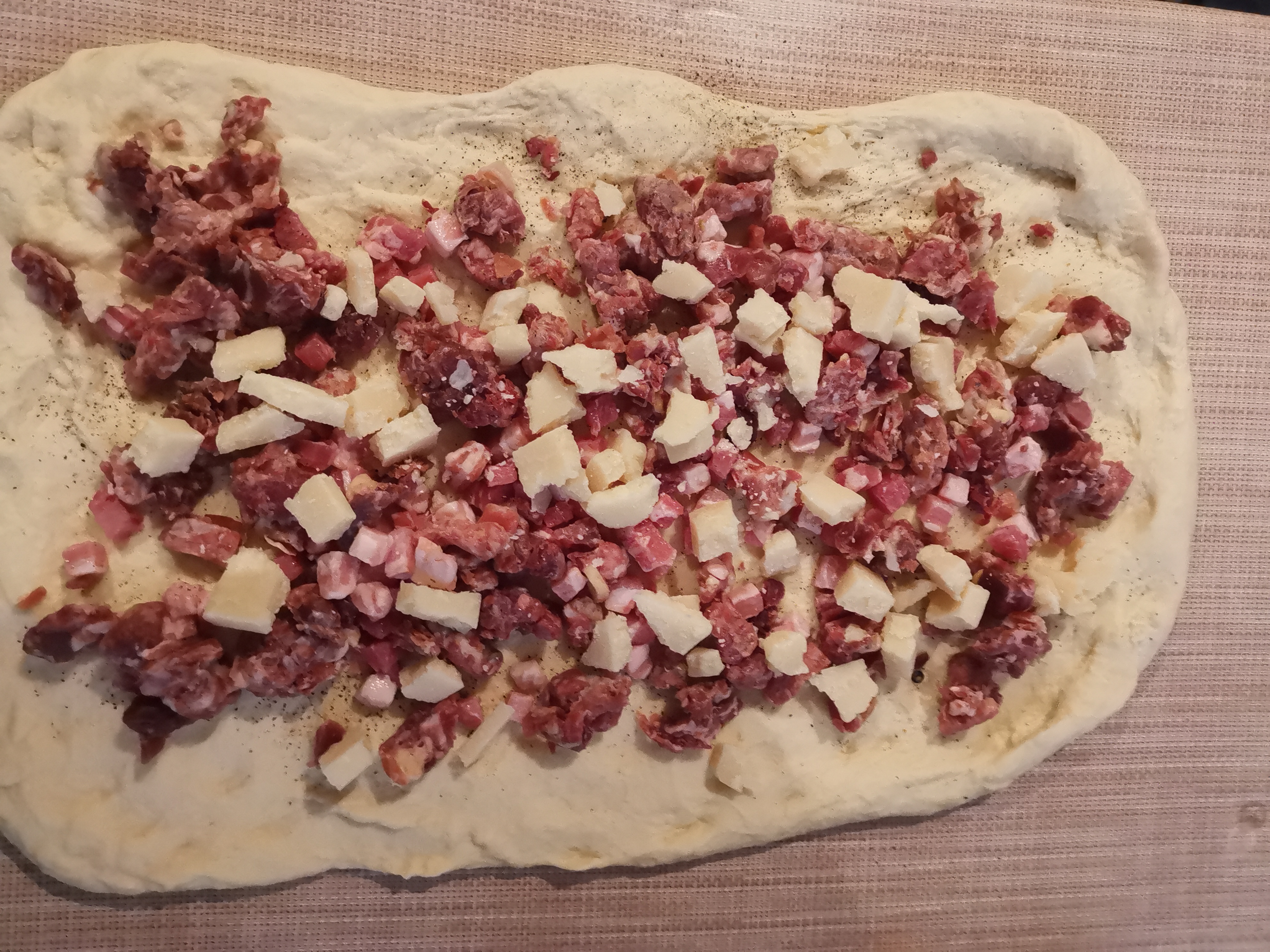 Appiattite leggermente l’impasto, spolverarlo con un po di pepe, e versare i cubetti.