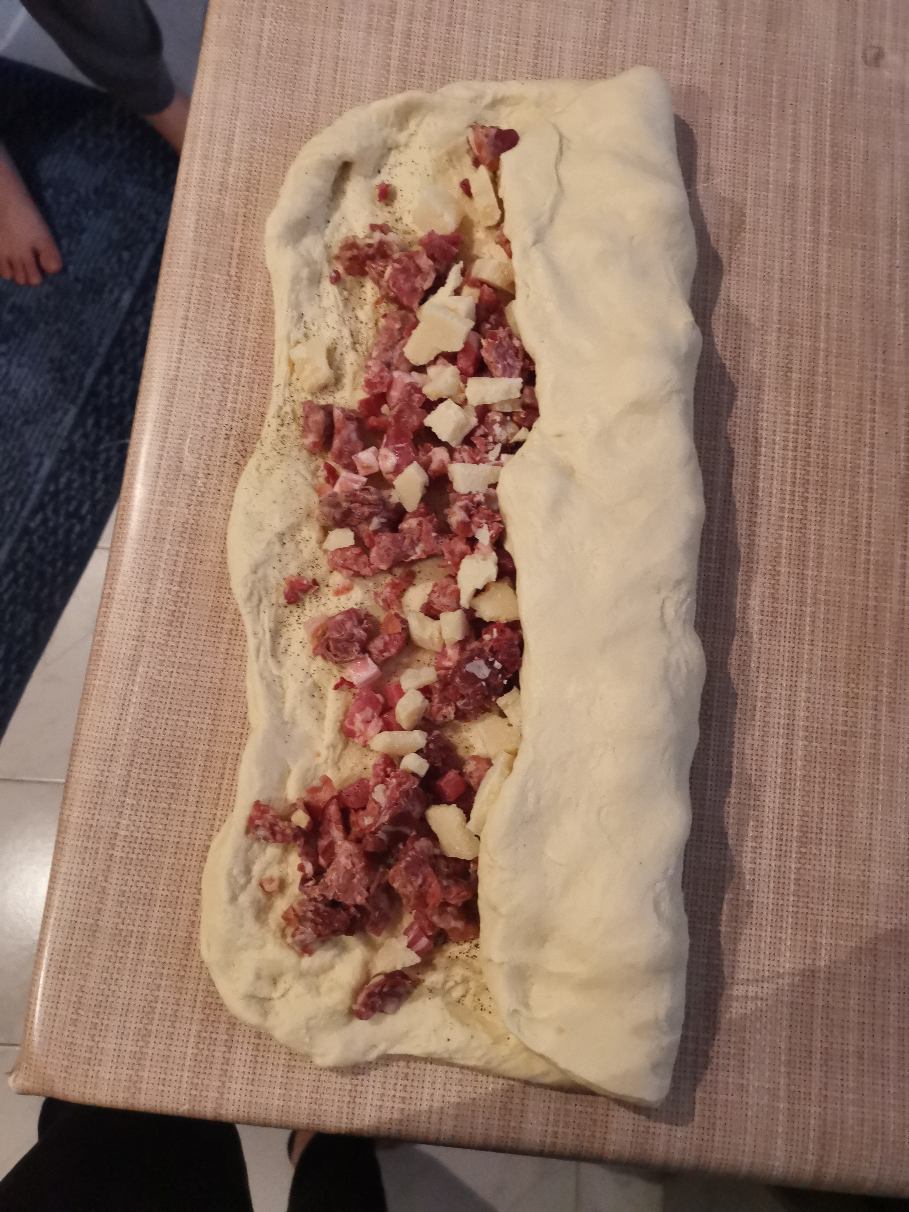 lavoratelo con le mani fino a quando tutti gli ingredienti saranno incorporati, maneggiando l’impasto per estenderlo a filoncino.